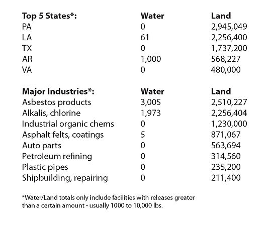 Asbestos Releases to Water and Land, 1987 to 1993 (in pounds):
